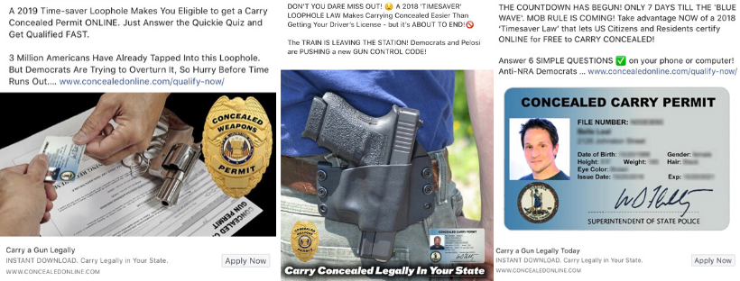 One of Facebook’s biggest political advertisers is running an elaborate scheme to trick people into believing that a legal “loophole” allows them to qualify for and purchase concealed-carry permits online. The multimillion-dollar ad operation actually sells handgun safety certificates rather than legitimate permits, and urges people to buy them right away before Democrats intervene.